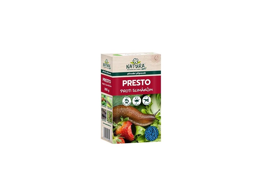 NATURA PRESTO Přírodní přípravek na slimáky a plzáky na venkovních záhonech, ve skleníku i pařeništi. Je vysoce účinný – unikátní formulace, k usmrcení škůdců stačí menší porce návnady než u konkurenčních produktů (účinná látka ovlivní metabolismus škůdců, což vede k rychlejšímu pocitu sytosti, snížení žravosti, přestává se tvořit hlen a škůdce leze do úkrytu).